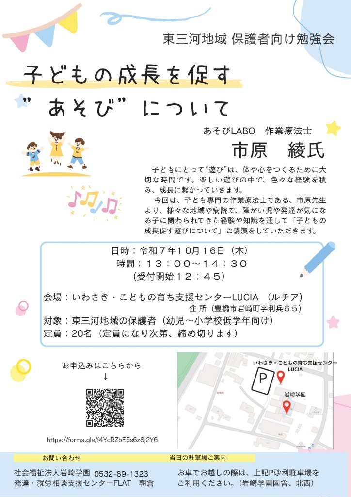「障害児等療育支援事業」の取り組みとして、2025年10月16日(木)に、保護者の皆様に向けた勉強会を開催します。